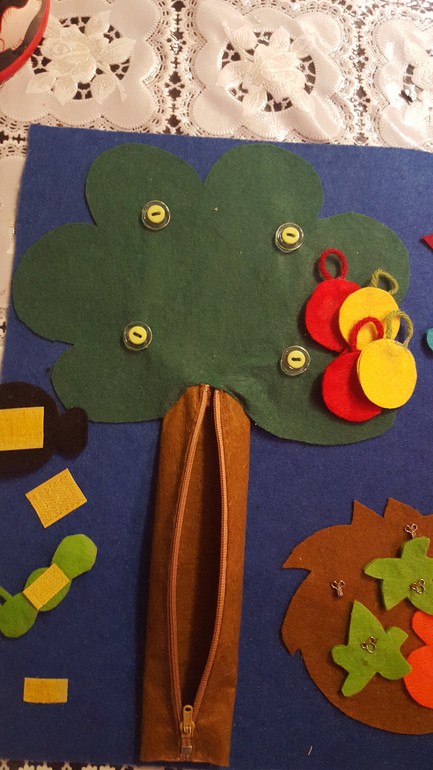 На дереве яблочки на петельках, ствол на молнии, божья коровка и гусеничка на липучке.