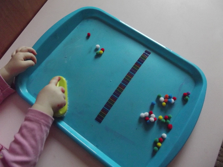Подметаем помпоны с одной половины подноса на другую.