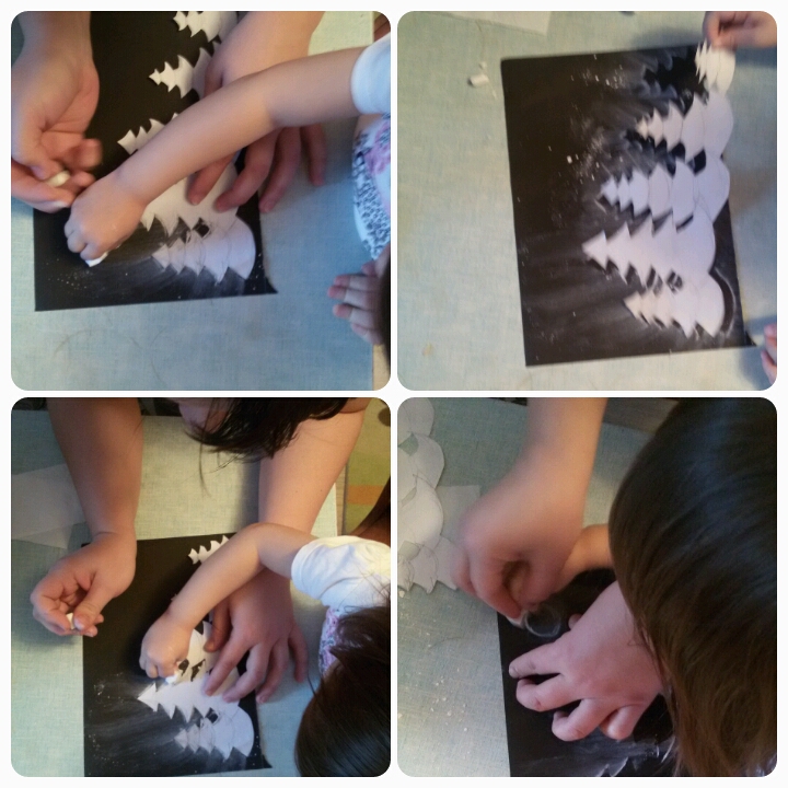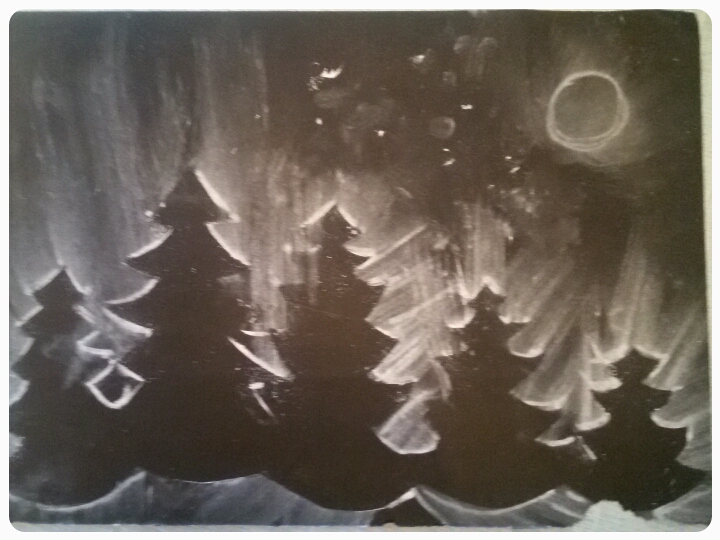А здесь рисовали на черной цветной бумаге ( не глянцевой), при помощи трафарета и пастельного мелка. Я обвела контур ёлок по трафарету, а Саша растирала салфеткой границы. Получилось такое свечение - заснеженность.)))