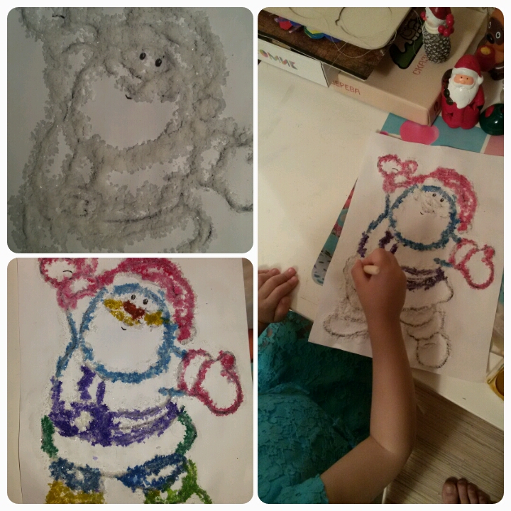 Художественно-эстетическое развитиеПродолжаем наше зимнее творчество. Очень нам нравится рисовать нетрадиционными способами. Считаю, что это развивает фантазию, интерес к рисованию, вносит разнообразие в тактильные ощущения, в мироощущение. Дочке интересно; после определенного занятия на заданную тему, у нас продолжается рисование предложенными материалами; там уже идет свобода творчества и полет, не успеваю менять листы бумаги и воду в баночке; порой потом мою не только кисти, но и стол, стул, а иногда, и пол.)))))