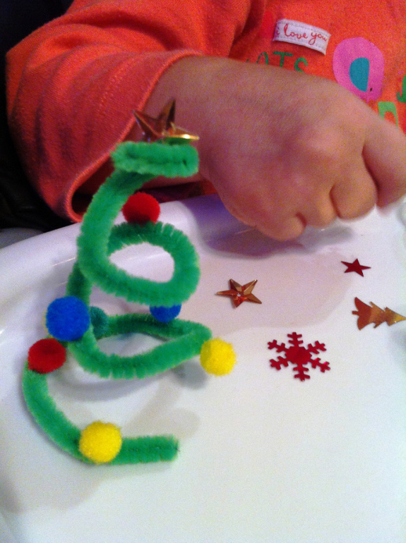 Все тоже новогоднее конфетти (из магазина Fix price), а так же маленькие помпоны (куплены в май-шоп), стали украшением для елочек из синельной проволоки (дешевле всего на тот момент оказалось на сайте алиэкспресс).
