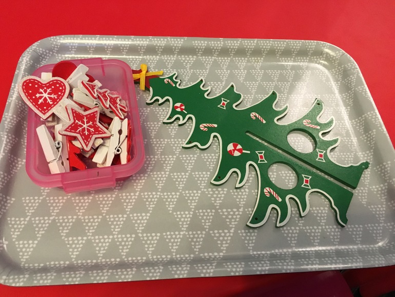 Следующее предложенное мной задание, так сказать, вдогонку к уходящим праздникам. Нарядить елочку при помощи маленьких прищепочек. Не привлекло, вот совсем. Долго даже не подходил, потом прицепил несколько штук, отцепил и все. А мне казалось, что идея должна понравится. Не угадала.