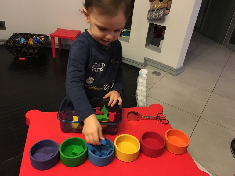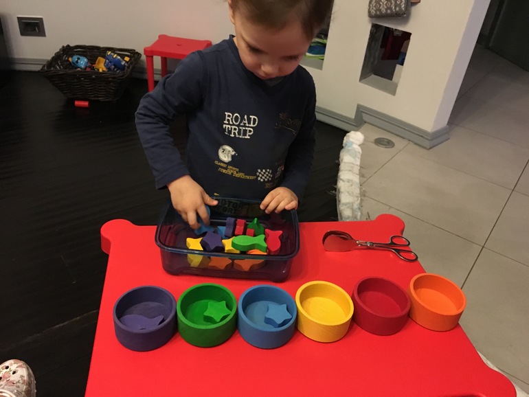 Рассортировать деревянные фигурки по мисочкам. Предлагала выполнить сортировку при помощи необычных щипцов, не ребенок не понял этого хитроумного устройства. Так что разложил фигурки просто ручками.
