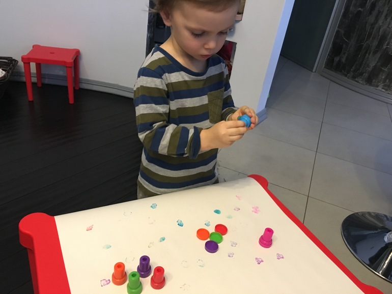 И парочка вариантов на сортировку по цветам. Подобрать колпачки к цветным штампикам. Справился сразу и без ошибок.