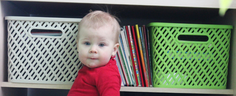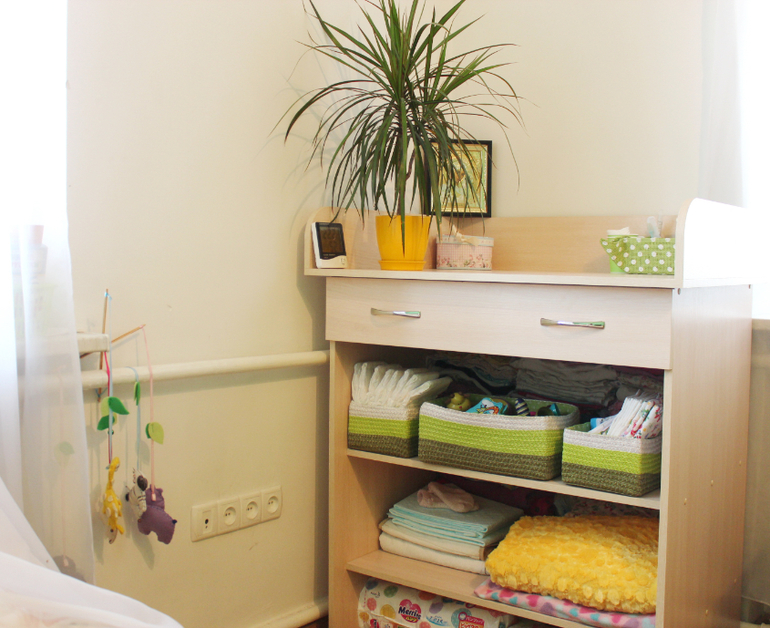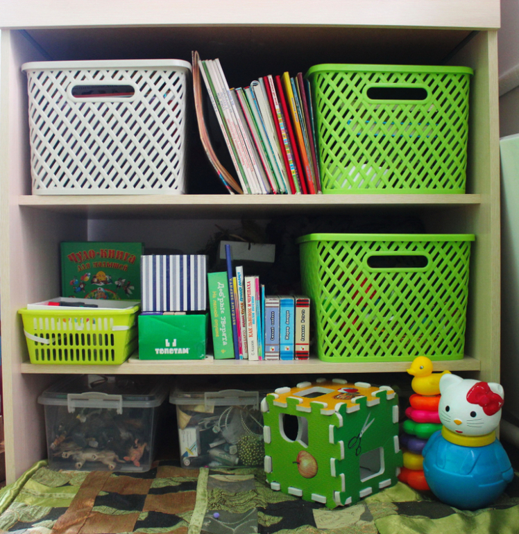 Верхняя полочка не вошла в кадр. Там сейчас хранятся наши карточки, пазлы, мои материалы для занятий, и аптечка.