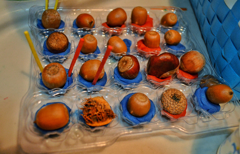 Достала жёлуди. Дашуля была садовницей. Очень она это дело уважает. Можно ещё сделать разноцветный сортер: в ячейки прикрепить пластилин разных цветов, вложить туда жёлуди, а шляпки с пластилином предложить распределить по ячейкам малышу.