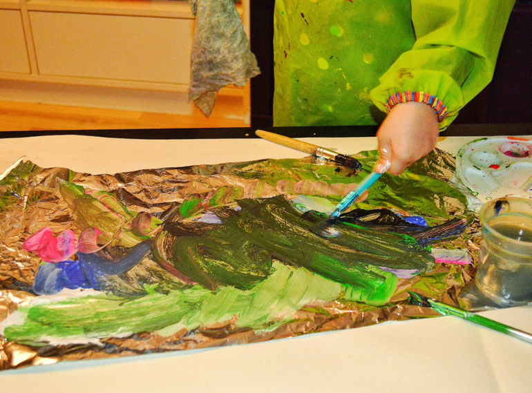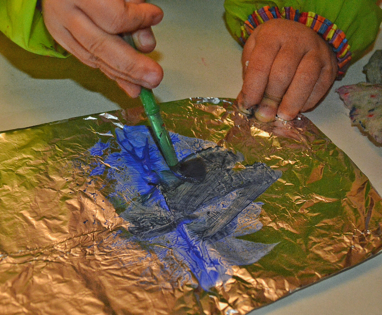 Можно разрисовать одну половину, а потом загнуть другой. Из-за фактуры фольги получается всегда разный и очень красивый рисунок. Здесь все, что успела сфотографировать. Даша решила, что это иней.