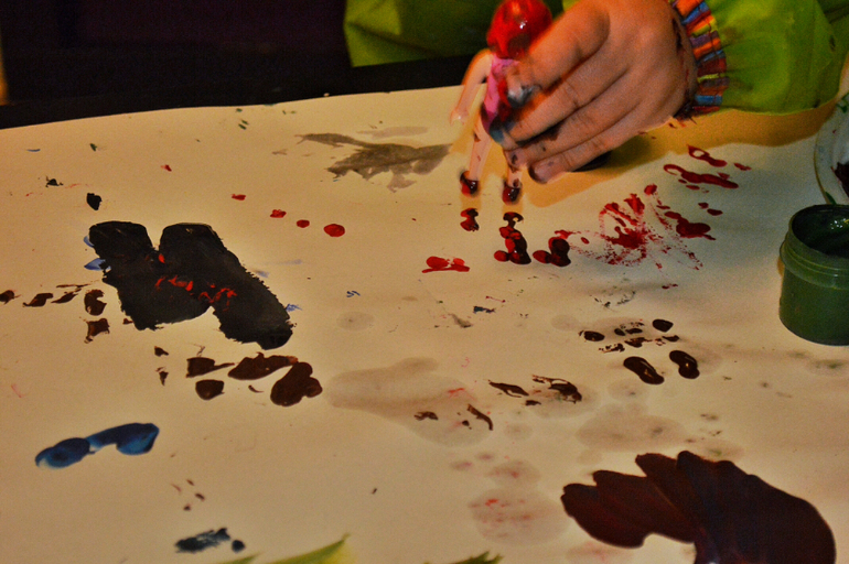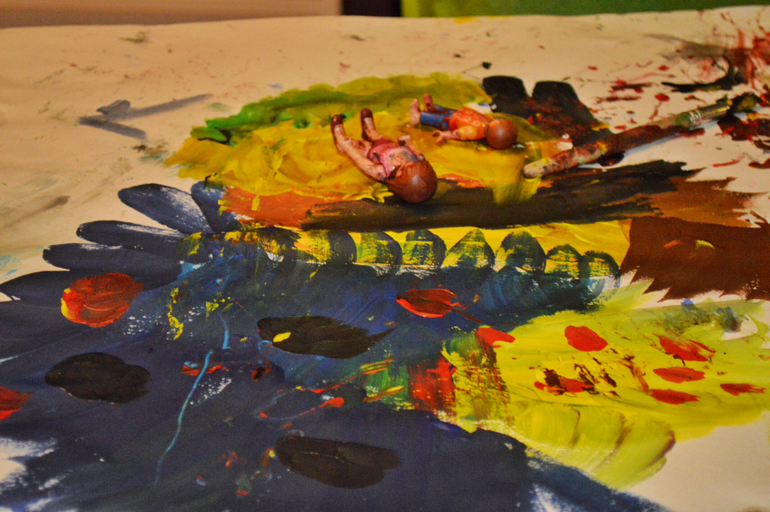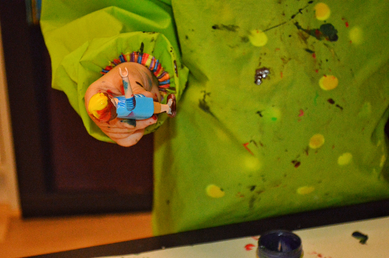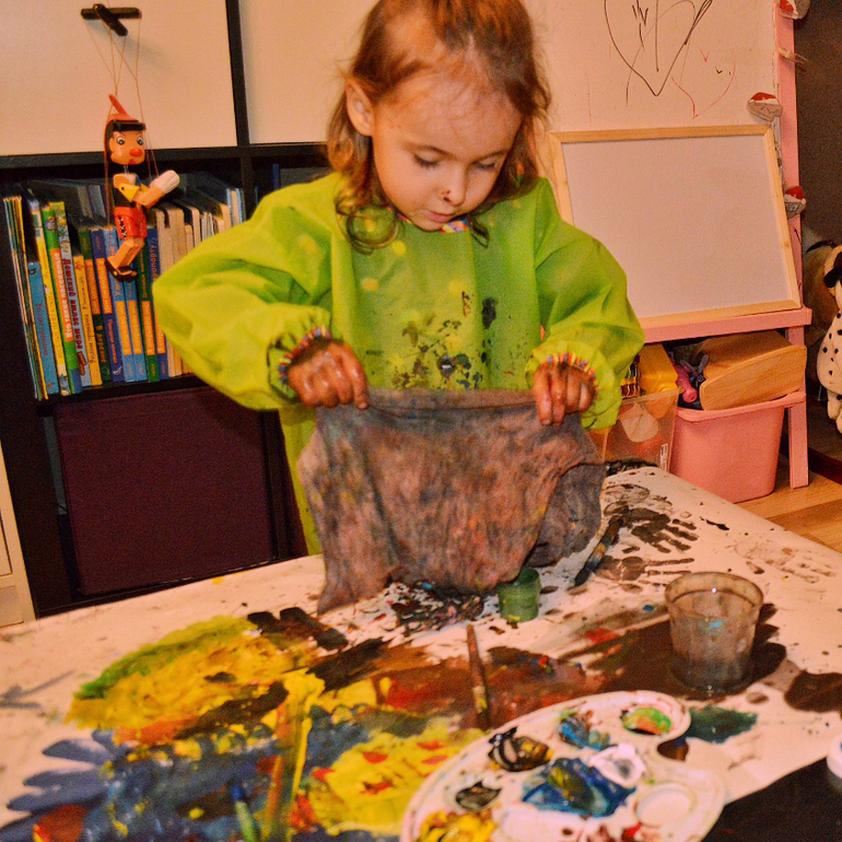 А в заключение, просто решила тряпочкой рисунок протереть. Я писала неоднократно: дочке можно все, но на ограниченном мной пространстве. За три года я не нарисовала ей ни одного приличного домика/дерева/кошечку/собачку. Зато она извела тонну краски на такие вот живописные работы),которые сейчас начинают превращаться в прекрасную экспозицию для игры. Мы и на себе и на столе и на чем только не красили и чем только вместо кисти не рисовали. И несмотря на то, что порой мне кажется, что я как-то неправильно рисую с дочкой, мне видится в такой вот возне больше плюсов, чем в предметном рисовании.