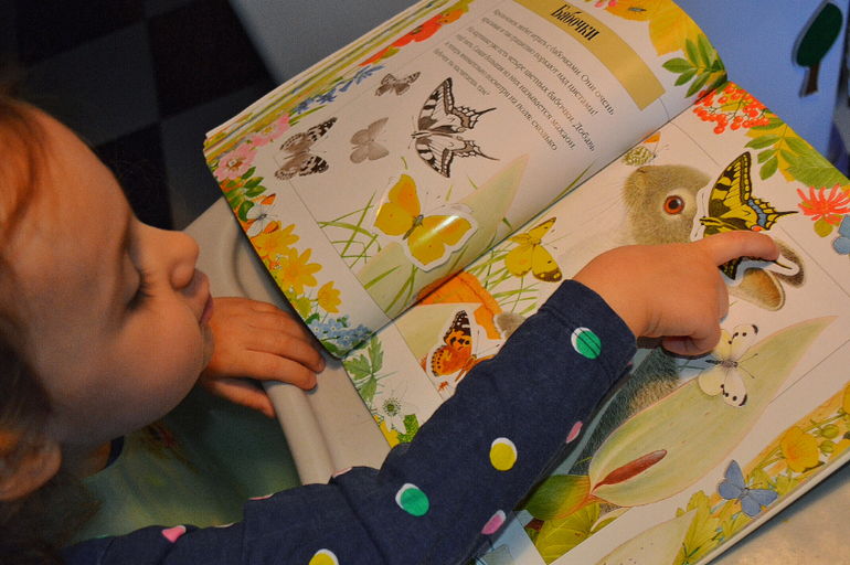 Клеили бесконечные книжки. Эта серия очень хороша: здесь можно не просто одеть девочек в карнавальные костюмы или расставить мебель. В ней собрано много интересных фактов о животных, насекомых, океане. Есть и развороты для произвольной работы: заполнить луг обитателями или лес или море.