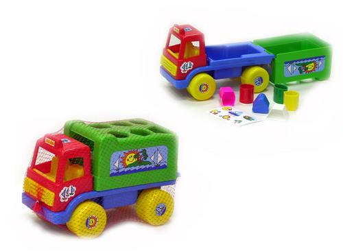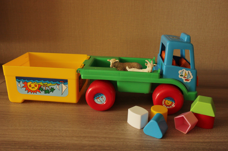 И я люблю многофункциональные игрушки, интерес к которым не пропадает длительное время. А эта игрушка одновременно и сортер, и вместительный грузовик для игры. Владюхе он понравился сразу. В отверстие он пытался засунуть не только предложенные фигуры, но и маленькие шарики, игрушки из киндеров, карандаши и все, что попадало в его поле зрения. А сейчас он любит сажать в кузов грузовика фигурки животных, а в кабину - водителя. И довольный возит их по всей квартире.