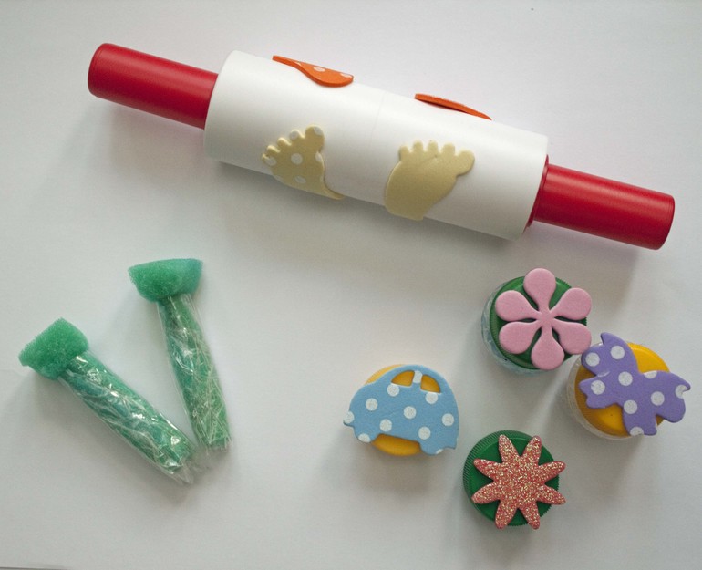 На скалку из набора для лепки наклеила те же наклейки из Fix price (пяточки и ладошки). Фото, к сожалению не сделала очень увлеклась я процессом, а дочке, к сожалению, этот инструмент понравился меньше всего.