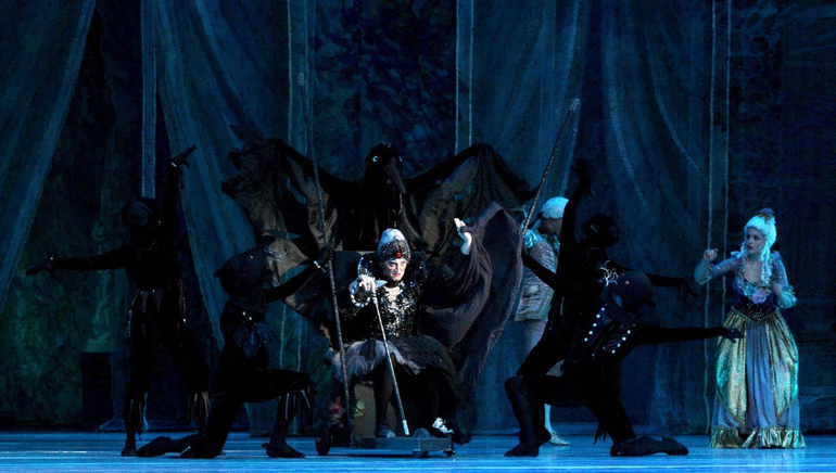 Старуха сбрасывает свой плащ и все узнают фею Карабос. С дьявольским смехом она исчезает.