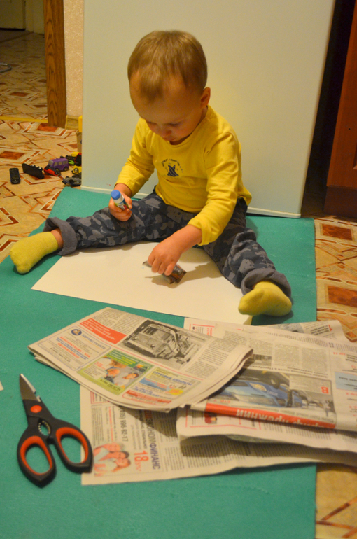 Дима последнее время проявляет интерес к работе с клеем, а я все тянула и тянула с аппликациями. Не знаю, даже, почему. Сегодня вижу, сын уже ну очень хочет клеить!!! Выбрали изображения машин в районной газете, я их быстренько вырезала, а Дима приклеивал.