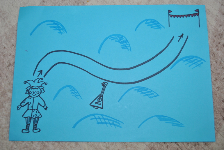 Скоморох приветствует Зиму, говорит, что она все дороги замела и его брат (второй скоморох) не может попасть на ярмарку. Он просит Машу помочь: сдуть снеговые сугробы и провести пальчиком по дорожке. Плюс, скоморох потерял в сугробах свою балалайку. Ее тоже необходимо отыскать.