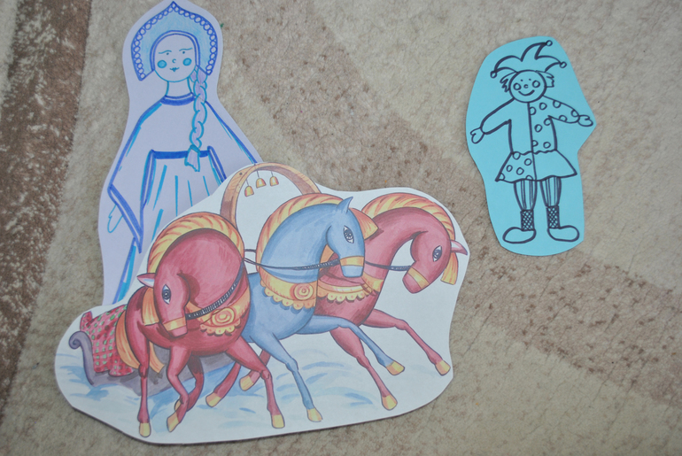 Идем со Снегурочкой на звуки, оказываемся на ярмарке! Там нас встречает веселый скоморох, который зазывает нас на праздник. Он объясняет, что сейчас встретятся Зима с Весной. И скоморох слышит звуки скачущих лошадей, удивляется, кто же это едет. А это приехала Зима!