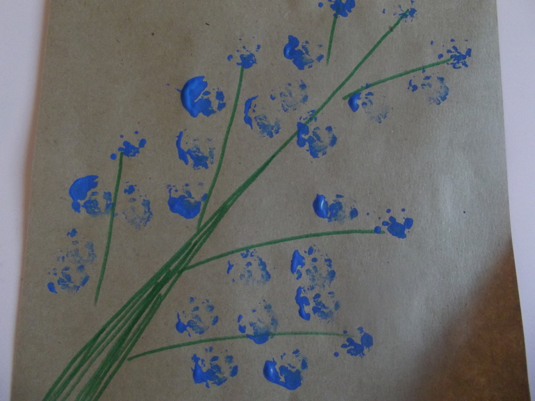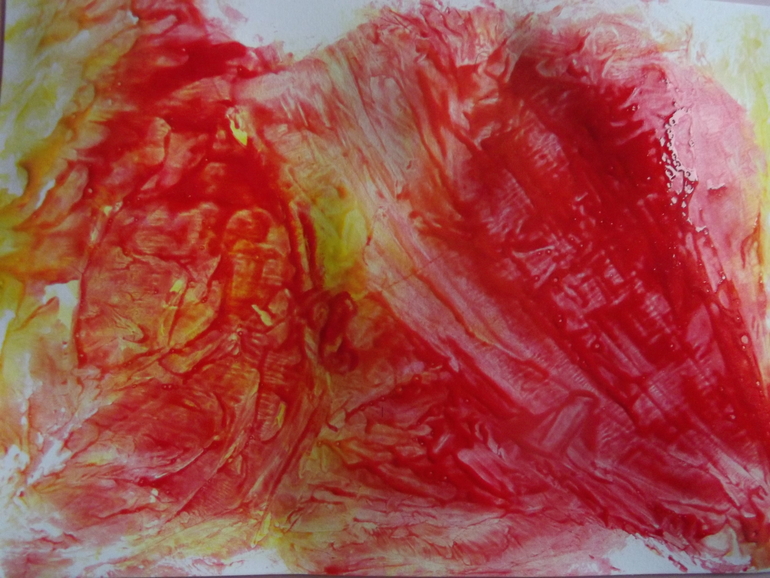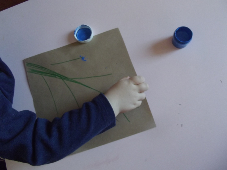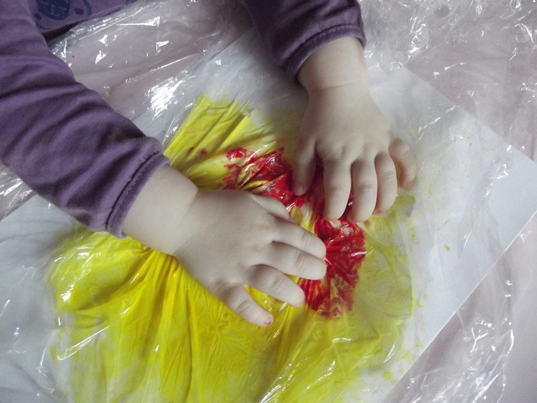 Лист бумаги , на него наливаете краски и накрываете пленкой.Рисуете пальчиками,ладошками.Мнете,трете,как угодно...