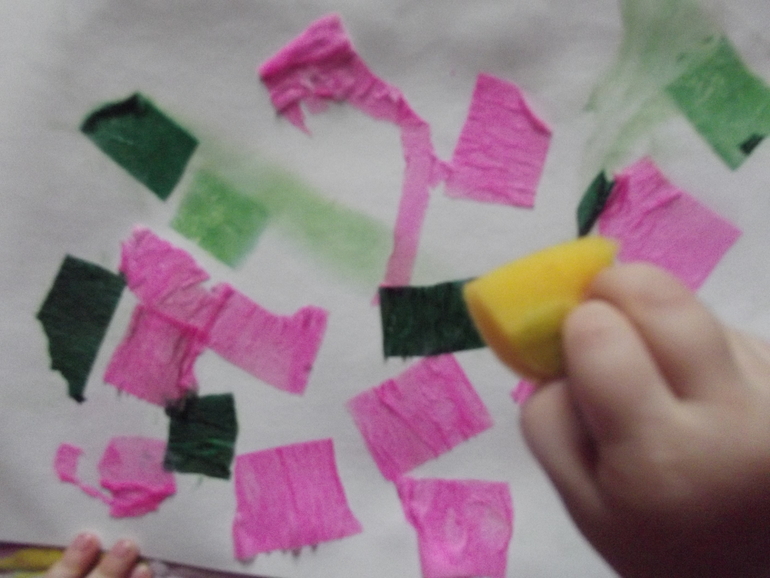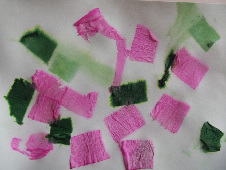 Лист акварельной бумаги смачиваем водой.Выкладываем кусочки бумаги,любого размера и цвета.От мокрого листа бумага начинает растворятся.Очень красиво!