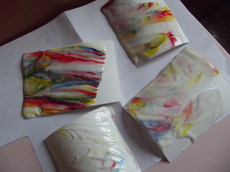 В тарелку наливаете клей , капаете краски . Рисовать удобнее всего зубочисткой.Получившийся рисунок отпечатываем на бумагу.