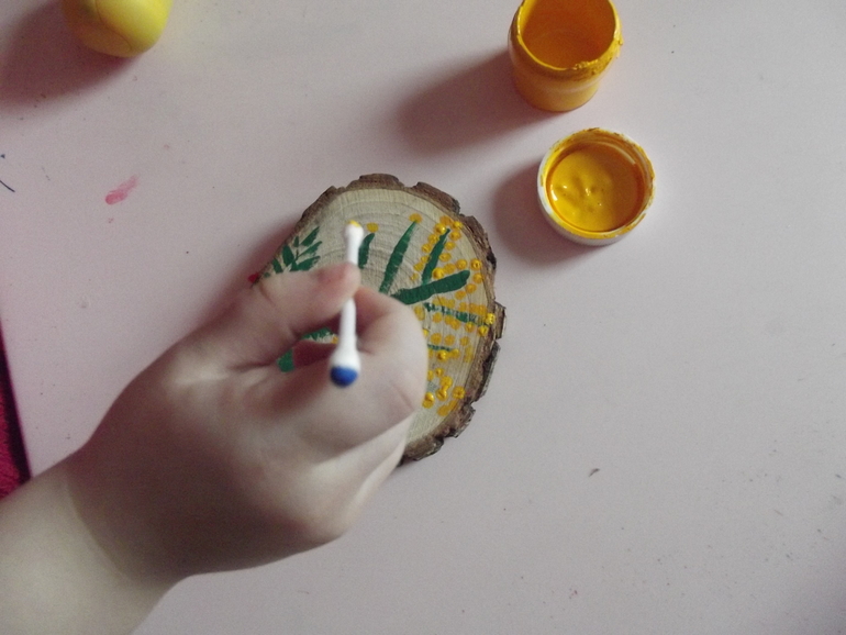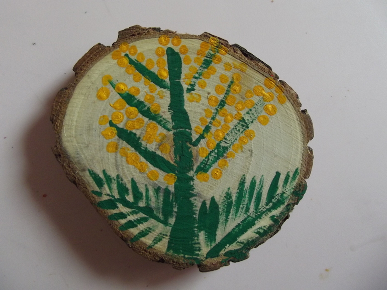 Для бабушек и подружек были приготовлены спилы с ярким весенним рисунком.Рисовали акрилом,а потом пропитали каждый спил горячим льняным маслом.