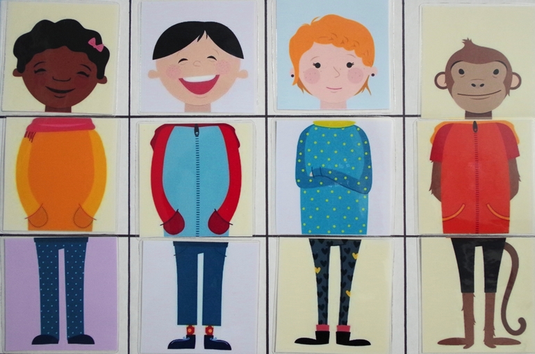 Еще играем так. Я раскладываю поочередно картинки по вертикали начиная с первой, при этом рассказываю какую-нибудь историю. Например: "Темнокожая девочка с розовым бантиком надела желтый свитер и голубые брюки в горошек. Она собралась в гости к темноволосому мальчику. Сейчас он одет в ... По дороге она встретила свою подругу в новом.... И подруга рассказала, что недавно видела в зоопарке странную обезьянку, на которой было надето...". Потом я убираю все карточки и прошу дочь положить так как они лежали. Такая своего рода сетка памяти))