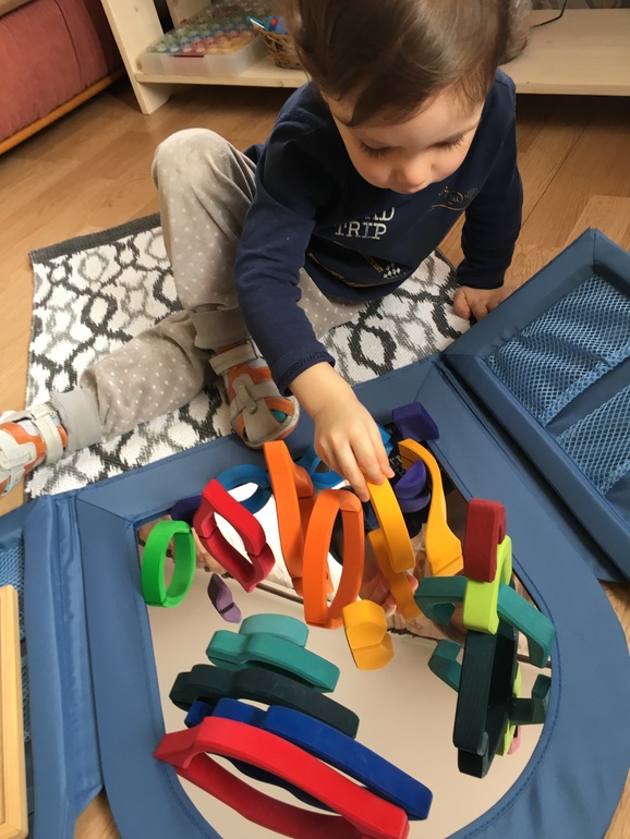Еще поиграли с зеркалом и деревянным конструктором. Выкладывали элементы конструктора на зеркальной поверхности и разглядывали, что получается в отражении.