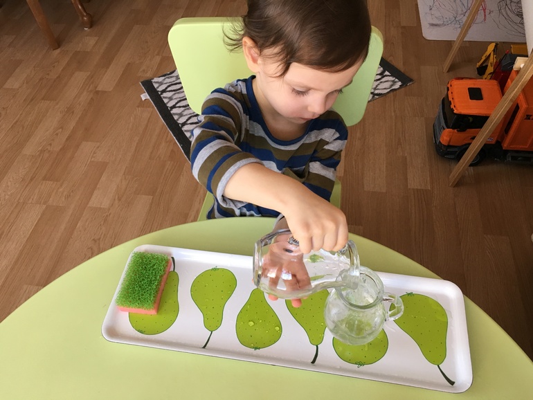 Затем перешли к переливанию воды в кувшинчиках. Уже хорошо получается, ни капли мимо. Правда когда перестает держать кувшин двумя руками, то бываю промахи.