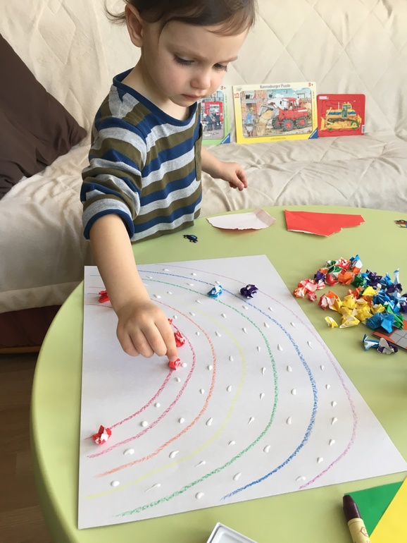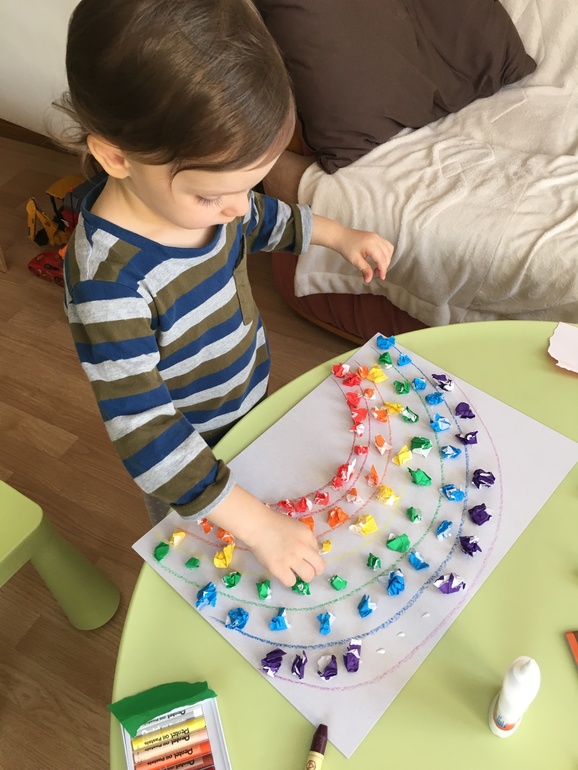 Сделали радугу из маленьких комочков цветной бумаги. Сначала нарвали цветной бумаги, потом ее скомкали, а потом приклеили.