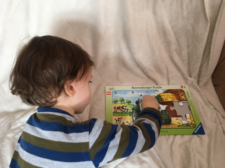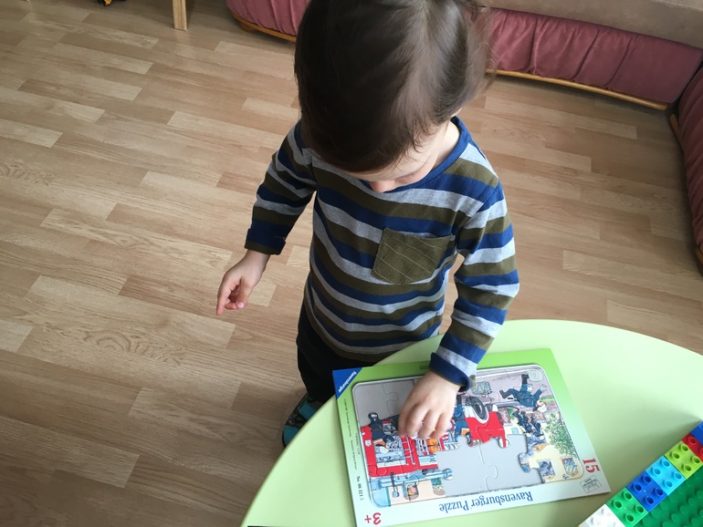 Проснулась любовь к пазлам, но только если там изображены машины. Другая тематика не интересует совсем, даже не подходит к пазлу. Пазлы с машинами собирает уже из 25 частей.