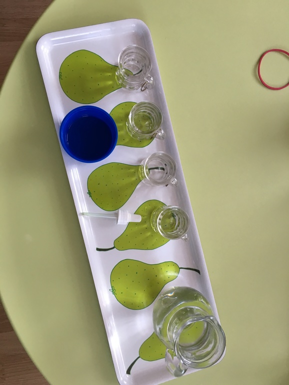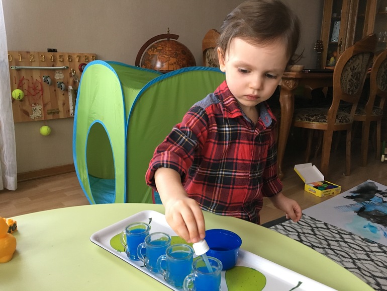 Пробовали упражнение на развитие цветовосприятия - капали пипеткой разное количество подкрашенной воды в стаканчики с целью познакомиться с оттенками одного цвета. Заинтересовал скорее сам процесс, чем результат.