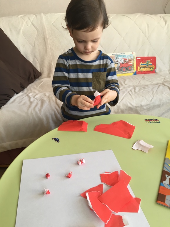 Вылавливали маленькие машинки из миски с водой при помощи щипчиков. Занятия с водой всегда хорошо воспринимаются ребенком.