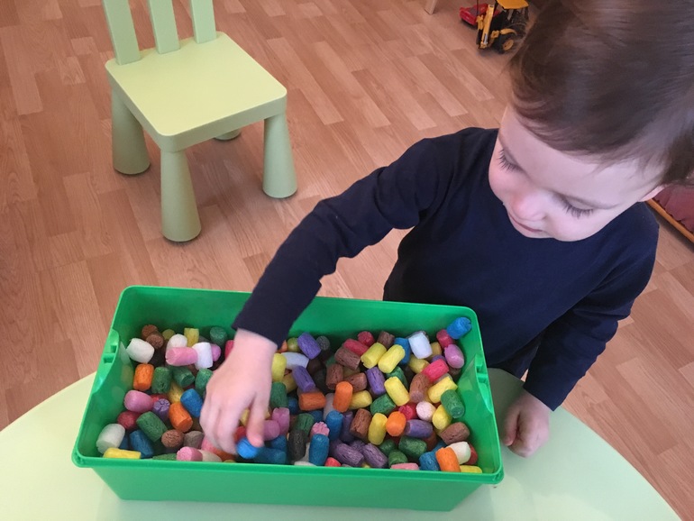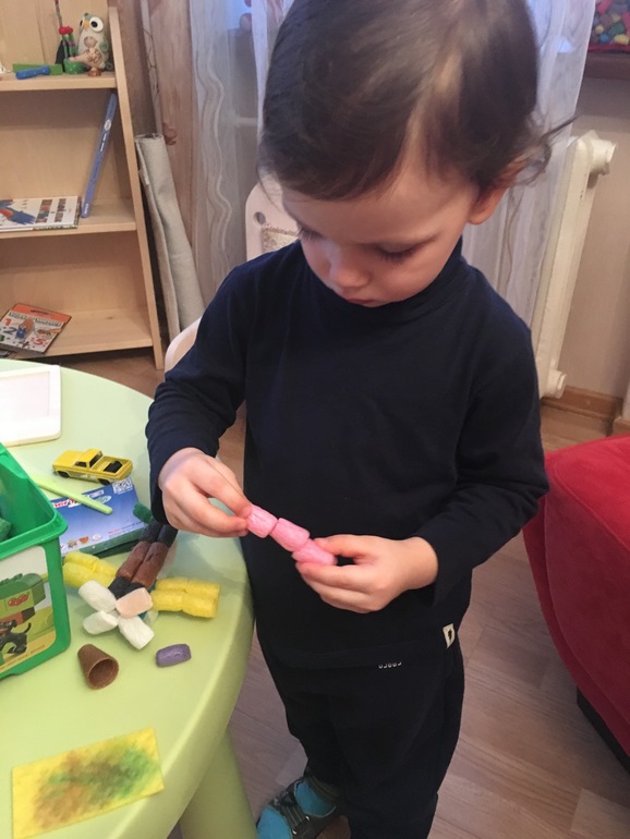 Поиграли с кукурузным конструктором. Интересная субстанция. Можно сказать и сенсорные ощущения новые получили и склеивать элементы попробовали.