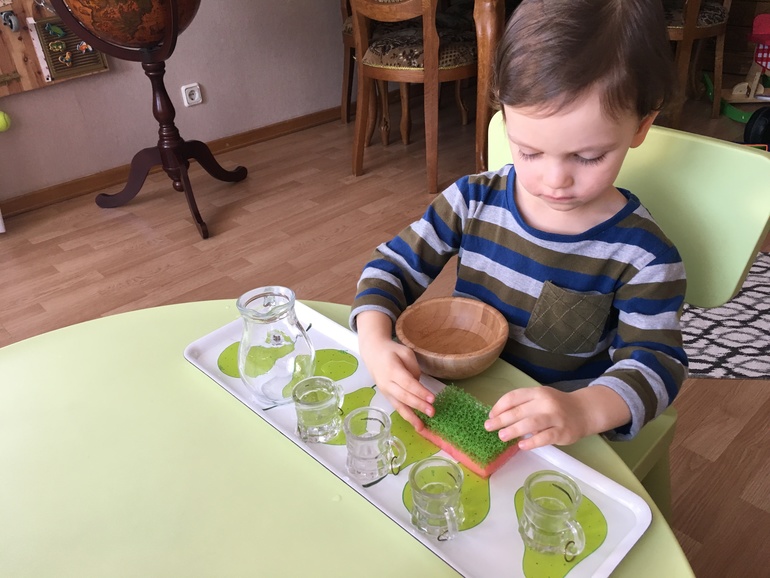 Предложила разлить водичку из кувшина по стаканчикам. Вся вода была сразу же вылита и таким образом перешли к упражнению с губкой - собирали разлитую водичку с помощью губки. Занятие очень понравилось ребенку и когда вся водичка была собрана, пришлось "случайно" разлить все еще раз.