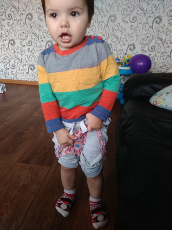 Научился одевать труселя,иногда не правильно конечно,но все равно упорно тянет их на себя.