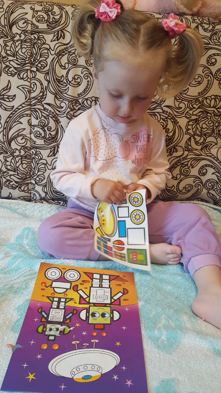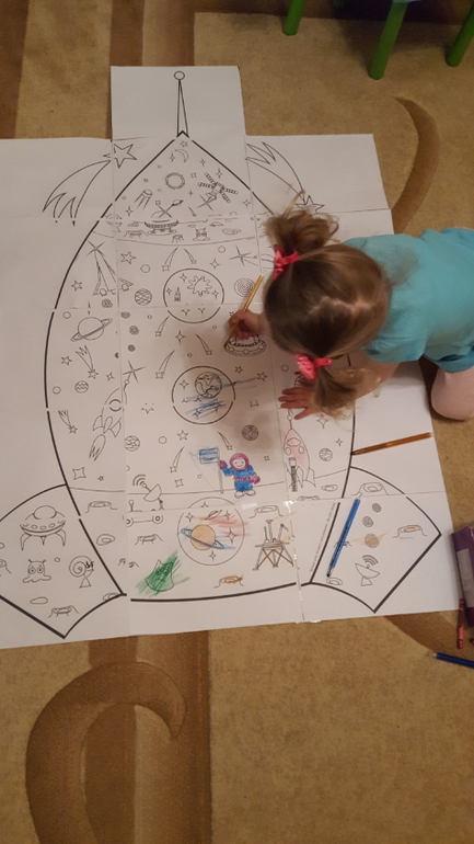 Появилась у нас и такая ракета. Счастья было - не передать! Не разрешала мне к ней подходить, потом все таки дала мне красный фломастер и разрешила заняться звездами) Мы и лежа. и сидя, и стоя… Эта раскраска к нам надолго!