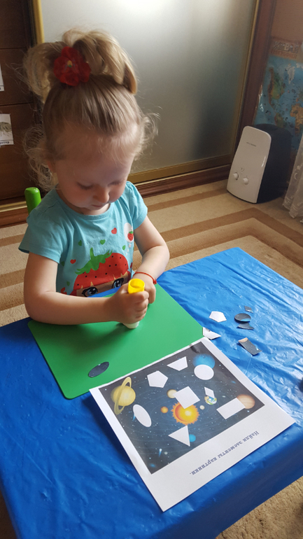 Повторяли геометрические фигуры, собирали танграм, который Полина просто обожает, а, если еще и клеить, то вообще!