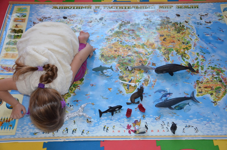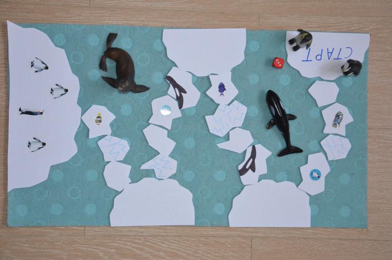 Льдины из бумаги, наклейки-пингвинчики, фигурки животных и кубик) Нужно перебраться пингвинам с айсберга в Антарктиду по льдинам.