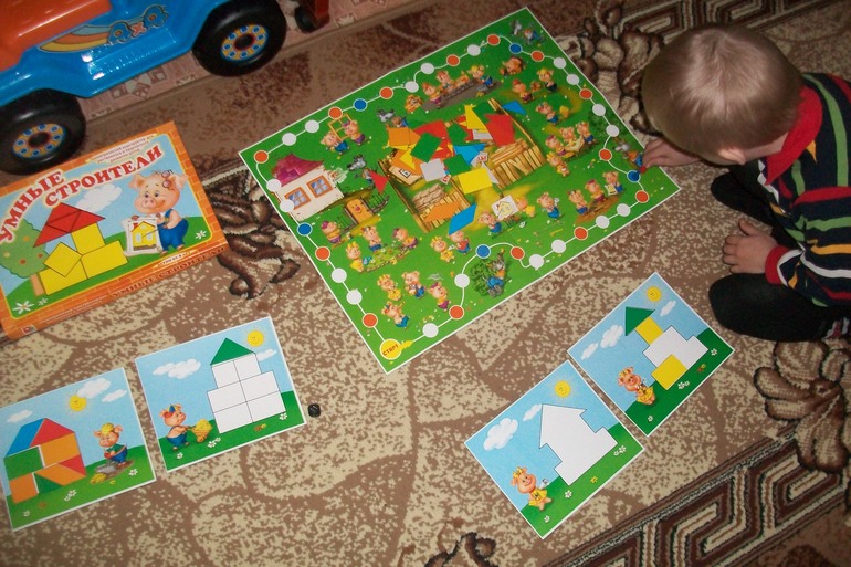А еще я купила для сына новую игру-ходилку с элементами танграма. Называется "Умные строители". В составе карта с фишками и домики, которые нужно построить из отдельных элементов. Кто быстрее построит свои домики, тот выиграл.