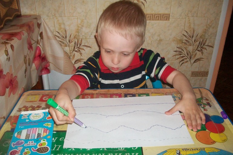 2. По пунктирным линиям нужно было провести линию фломастером. Вместе с ним, немного помогая, справились с заданием