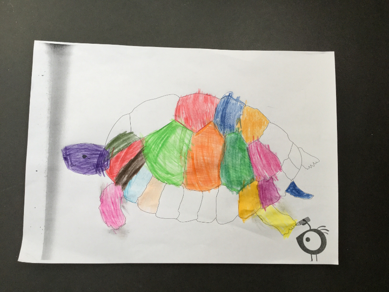 В итоге она сама и внизу голубой и бежевый квадрат уже рисовала с правильной штриховкой ( рука на весу ) и подправила другие квадраты , но надоела она ей)))