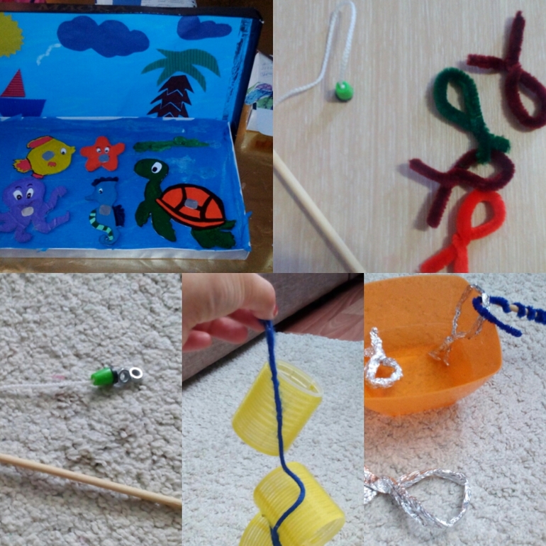 1. Классический вариант. В нашем случае, самодельный. Удочка с магнитом: палочка для суши+пластмассовый наконечник для одежды+магнитик от пришедшего в негодность магнита с холодильника Я делала игру по варианту предложенному Светланой. Получилось неплохо. Но Диме показалось не очень интересным. И тогда мама периодически стала предлагать другие варианты этой интересной детской игры. А именно: