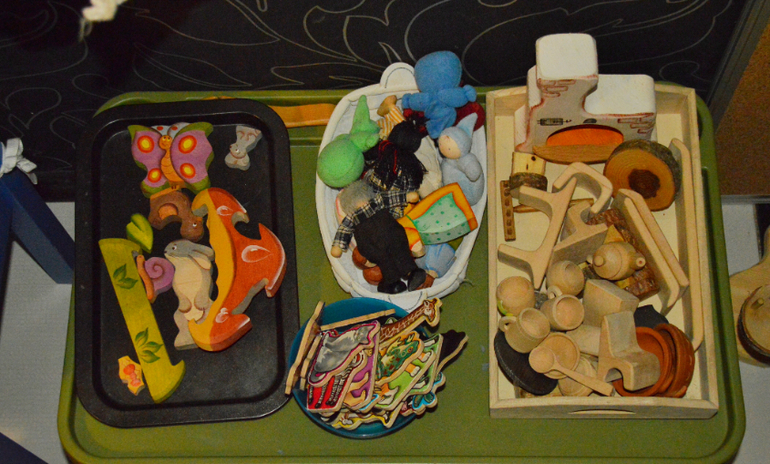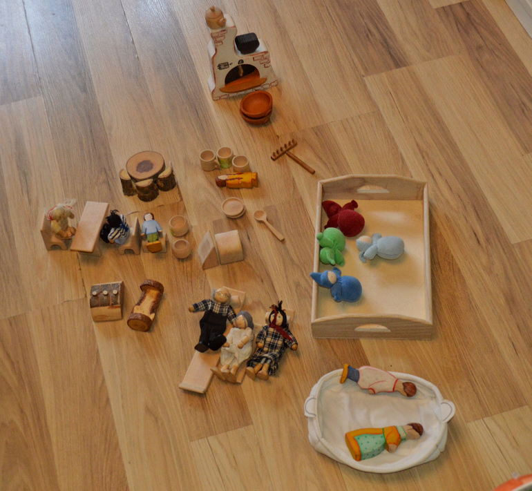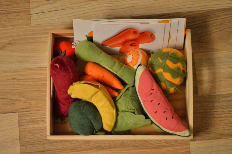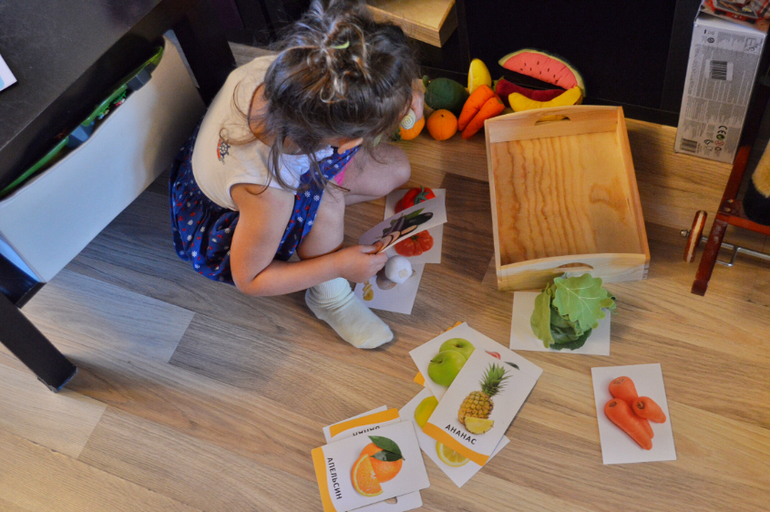 Простая сортировка. Сейчас Даша мало играет с крупными игрушками в ролевые игры: не засовывает их в плиту , не кормит кукол. Ей интересны сами действия с предметами: липучки на овощах, сортировка, раскладывание. По назначению идут у нас Лего, Плэймобиль и деревяшки- более мелкие предметы.