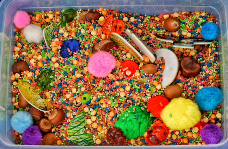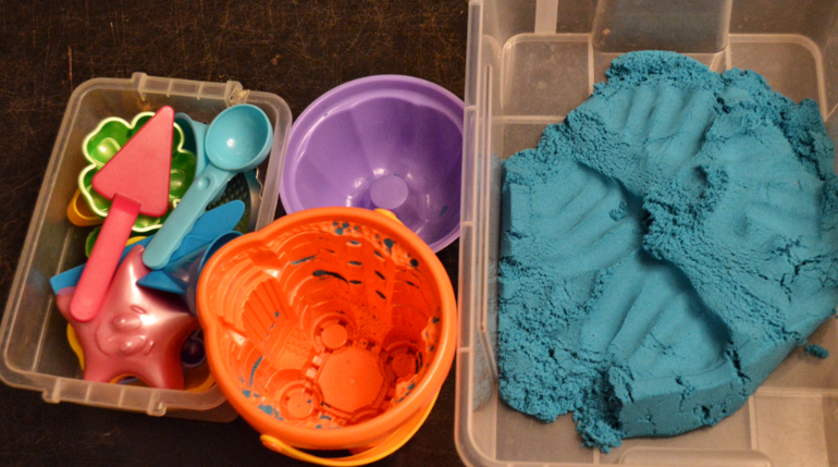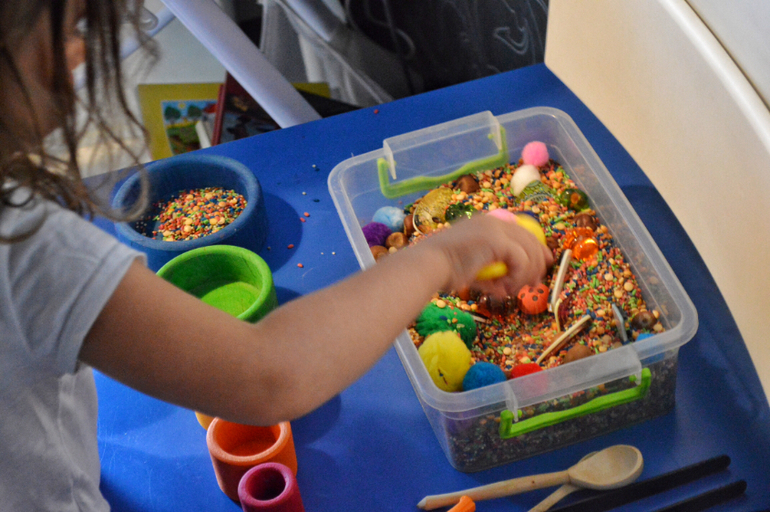 На синем столике на кухне всегда стоит контейнер с крупой/водой/ пластилином/ гидрогелем. Меняю часто лишь ложки-плошки)