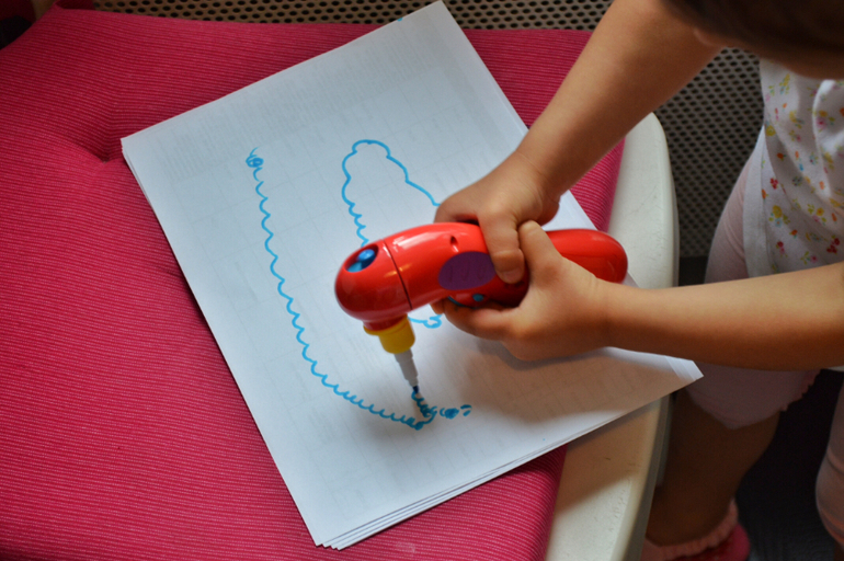 Это очень занятная штука. Подарила бабушка. Ставишь фломастер, включаешь, и он вращается вокруг своей оси. Получаются спиральки) Забавно. Дальше можно будет использовать для украшения поделок . Сейчас у ребёнка получаются барашки и облачка.