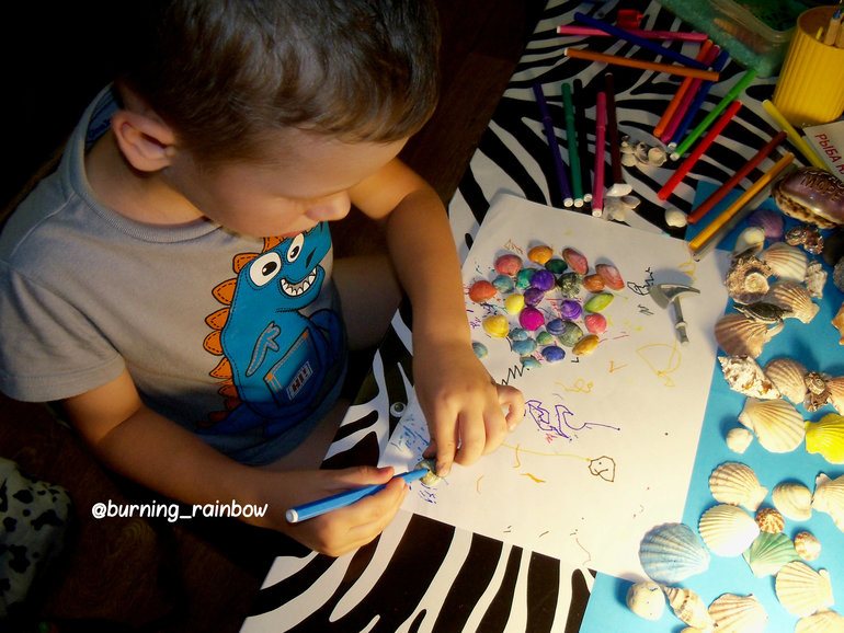 Ракушки мы выбирали не просто так, а для украшения, т.к. им очень захотелось быть красивыми и яркими. Миру идея с украшением пришлась по душе, и пока я бегала за водой для красок, сын решил использовать фломастеры и приступил к делу.