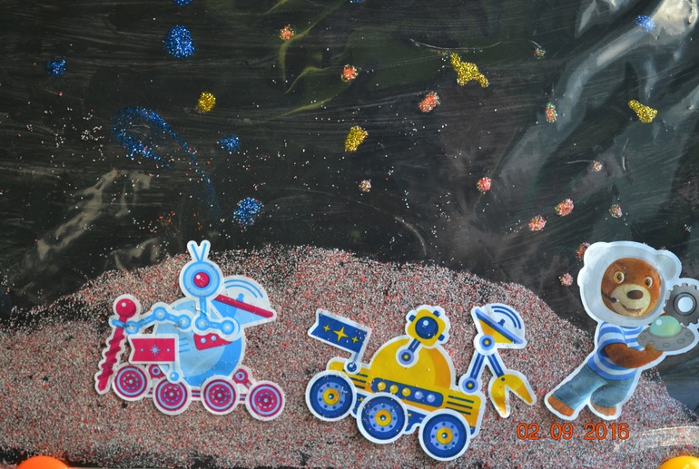 Марс сделали из окрашенной гуашью манки (осталась от космического путешествия Лунтика). Вспомнили, что Марс называют красной планетой. Звезды из тех же тюбиков (нравится нам ими рисовать). И вот такие марсоходы у нас получились из наклеек. Еще раз поговорили о том, что человек побывал только на Луне, а другие планеты для нас пока недосягаемы. Но несмотря на это, их мы изучаем при помощи таких планетоходов.