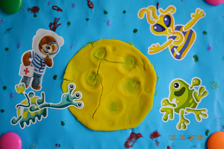 Луну сделали из теста для лепки. Наклеили ее на "небо" и стали имитировать столкновения метеоритов с этим небесным телом (метеоритом был шарик), после чего на поверхности оставались углубления-кратеры. Пришлось уговаривать сына остановиться, так как он был готов изрешетить ее. В процессе создания луны мы вспомнили, что это спутник Земли, обращается по орбите вокруг нашей планеты, на поверхности есть кратеры, которые образуются в результате столкновения метеоритов с Луной. Поговорили о том, что человек побывал только на Луне, а до планет у нас пока нет возможности долететь, так как они очень далеко.