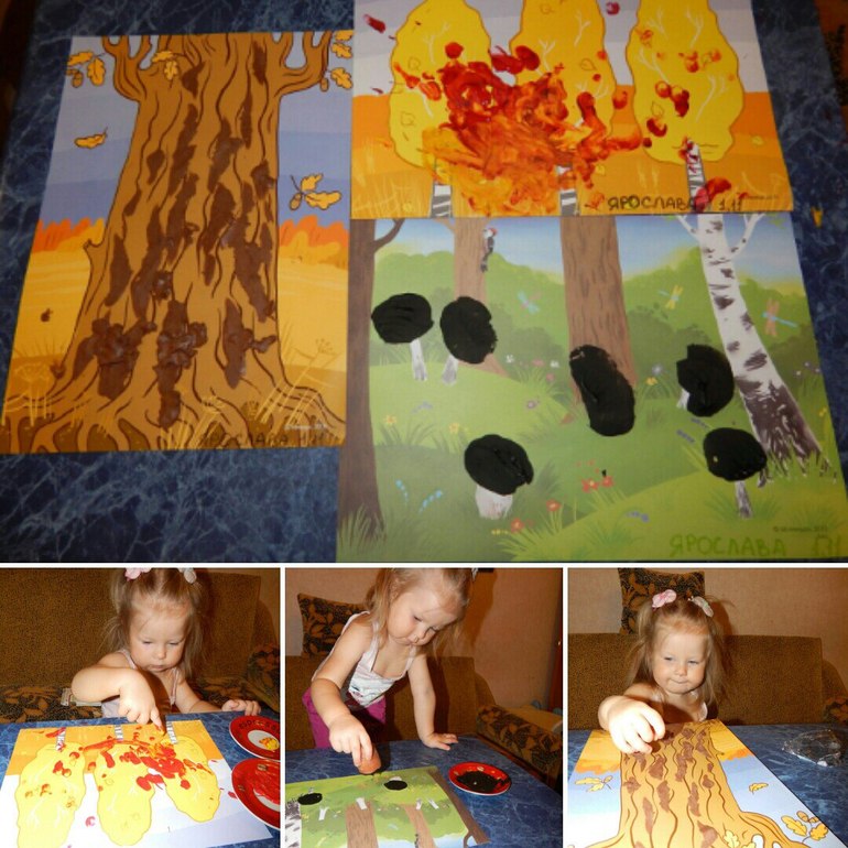 Рисовали листопад пальчиковыми красками, делали кору для дуба из пластилина, рисовали штампами из картофеля шляпки грибов.