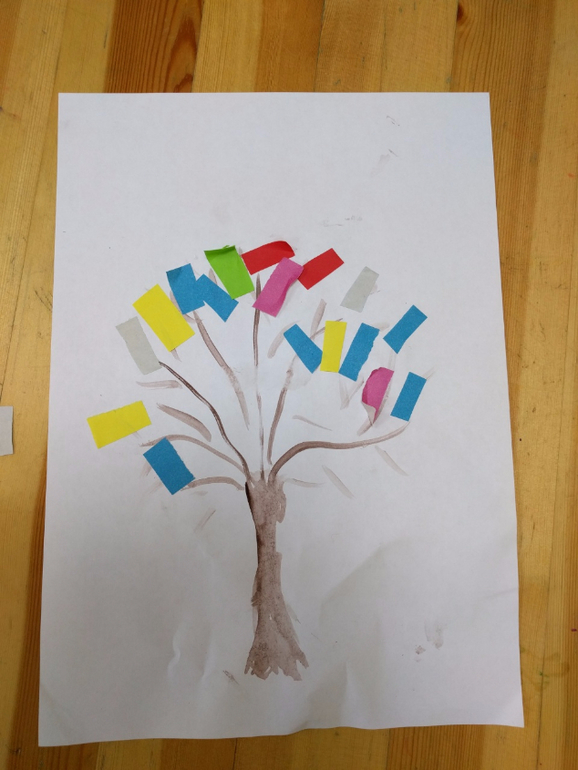 Потом творчество: рисовали дерево красками и лепили нарезанные бумажки вместо листьев на клей.