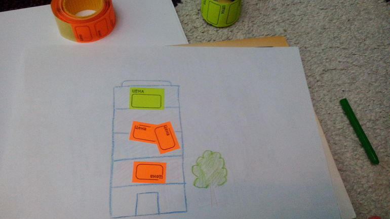 - Наклейки-ценники. Изначально, в целях экономии и ввиду избирательного характера сына, попробовали и замечательно у нас пошли разноцветные ценники. Просто приклеивали себе на части тела, попутно запоминая последние.