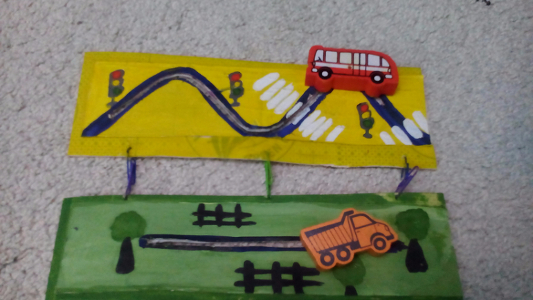 -"Дорожка для машинок". Трафарет для прочности сделала на куске линолеума. Машинки из вкладыша от Томика.